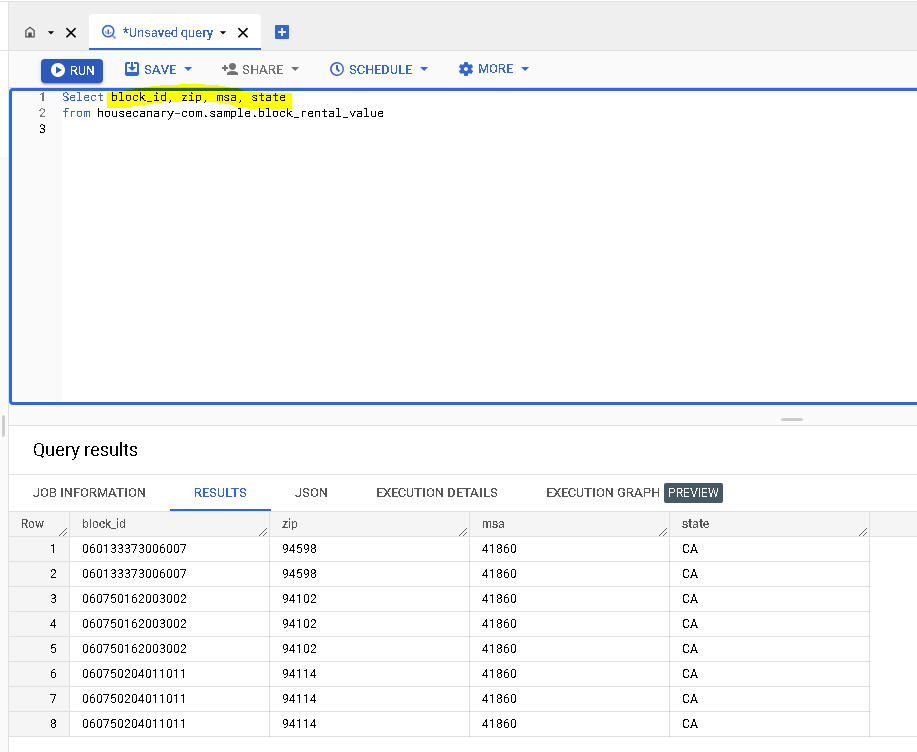 FROM DatabaseName.DatasetName.TableName아래는 예시로 원하는 column(blcok_id, zip, msa, state)들을 SELECT 문으로 모든 데이터가 선택되어 결과로 출력됩니다.