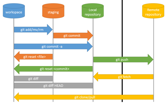 - 업무로 내가 코드를 추가/수정하고 보완할 경우, 모든 과정은 workspace에서 이루어지며, 이것을 서버에 업데이트하기 위해서는 수정된 코드를 Staging Area로 추가시킨다. 그리고 이것을 Local Repo에 저장시키고, Remote Repo에 연결해 변경된 내용을 업데이트한다.