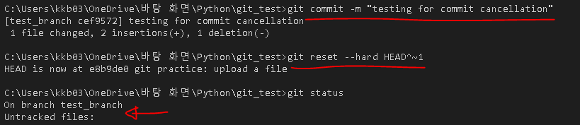 설명 : git reset --mixed HEAD^를 이용해서 commit 전 전 상태인 working directory로 되돌린다. (다시 commit하기 위해서는 git add부터 다시 해야 된다.)