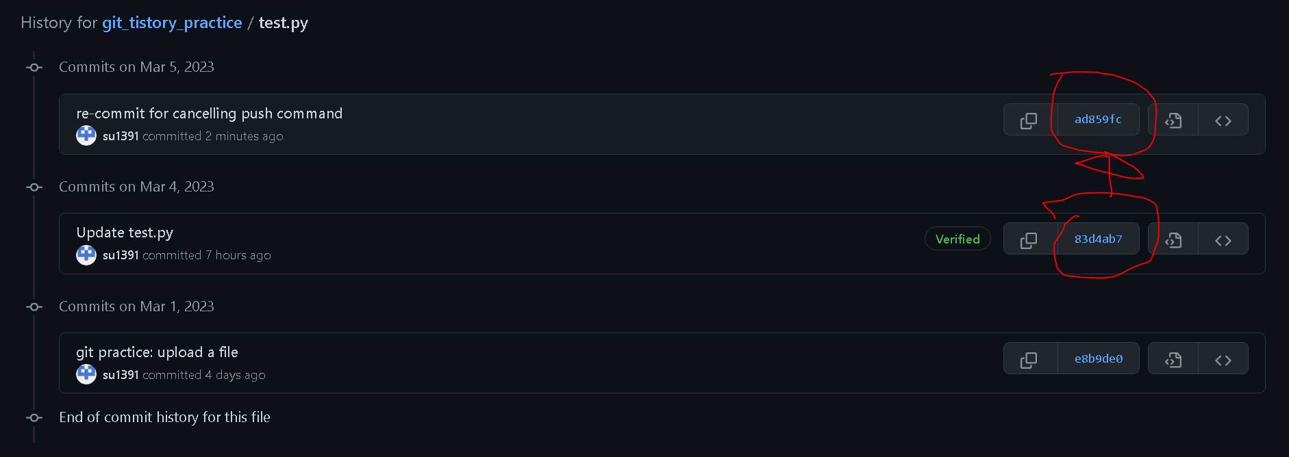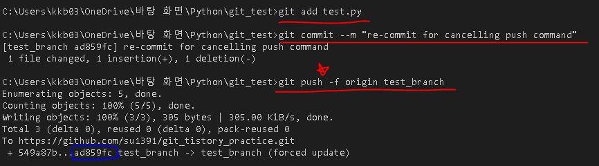 설명 : git reset HEAD^를 이용해서 working directory 상태로 되돌린다. 그리고 다시 새로운 업데이트를 push할때, git push -f origin test_branch로 강제로 push한다. 맨 마지막 사진을 보면 첫 번째 사진의 push "549a87b"가 존재하지 않는다. push -f로 한 "ad859fc" push가 "549a87b"를 덮어썼기 때문이다.