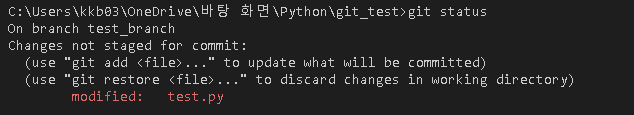 예시로, Branch에서 파일 하나를 업데이트하였다. (modified 되었다고 M이라고 적혀있다)