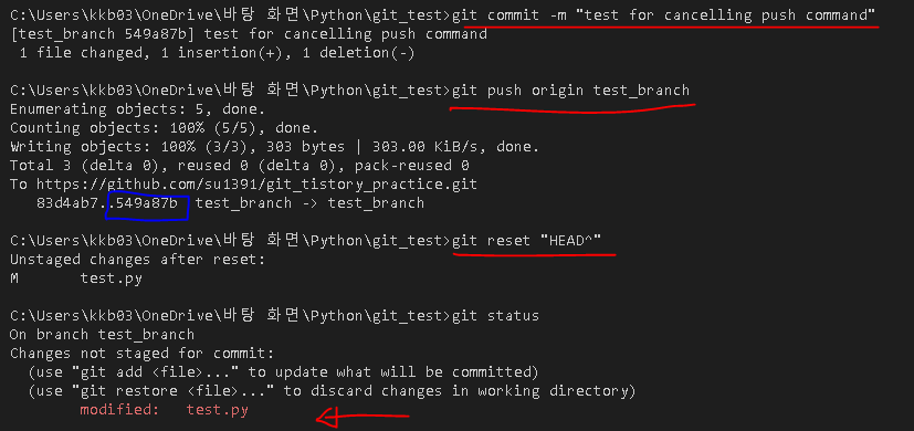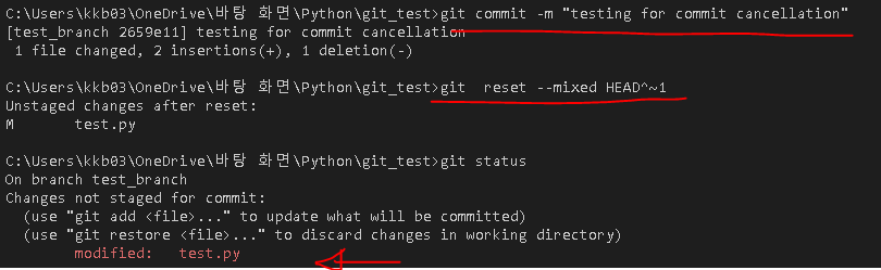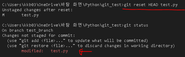 설명 : git add test.py로 파일을 staging area로 추가시키고, git reset HEAD test.py로 파일을 working directory에 다시 되돌린다.
