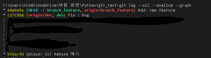 - 위 그림 설명: git rebase 하기 전에는 'branch_feature' branch에 'Fix: bug' commit이 존재하지 않았고, git rebase 후에 dev에서 업데이트된 commit을 들고 온 것입니다.