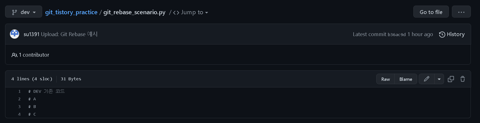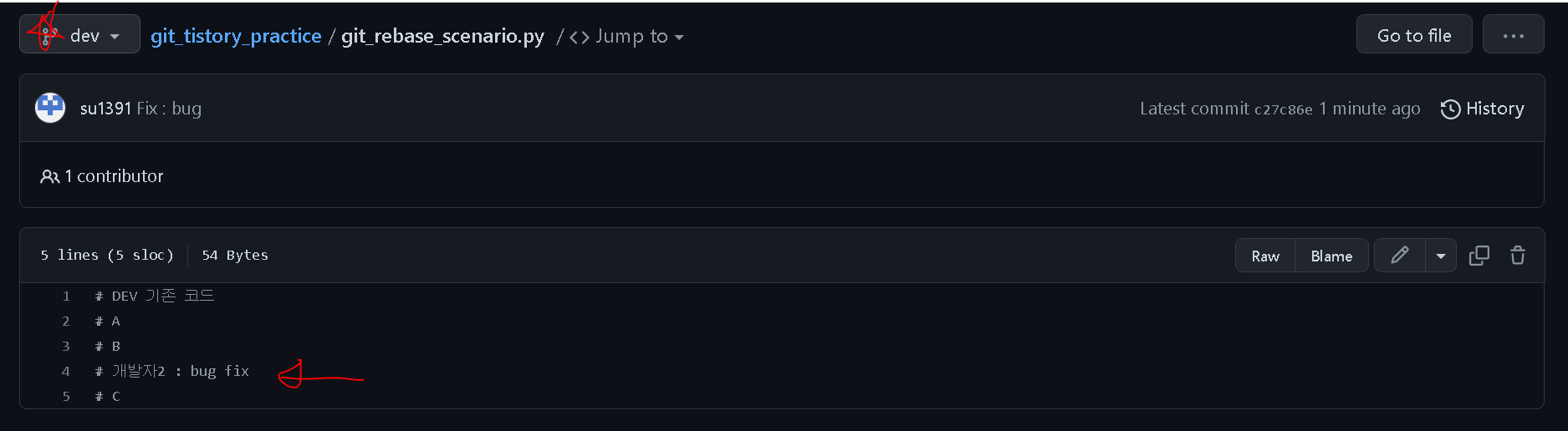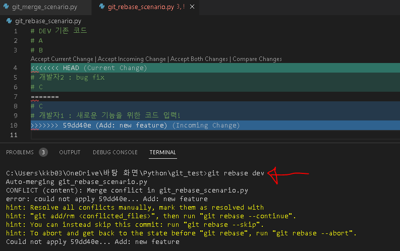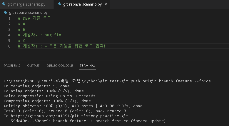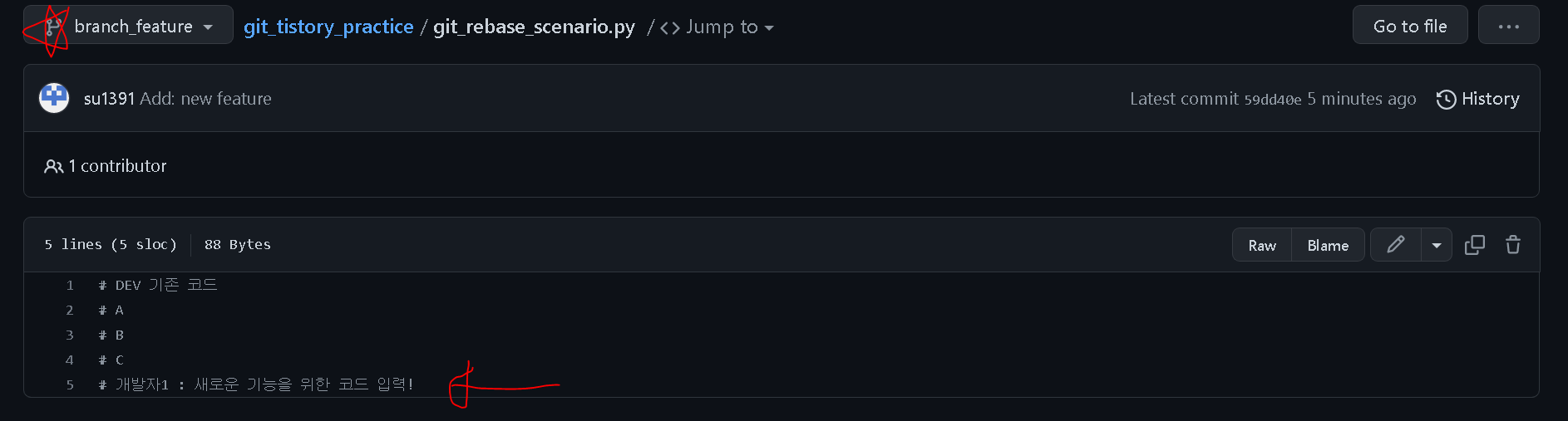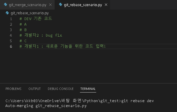 - Dev branch에 git_rebase_scenario 파일에 다른 개발자가 업데이트하였습니다.`branch_feature`에 git_rebase_scenario 파일에 새로운 기능을 위해 코드를 추가하였습니다.
