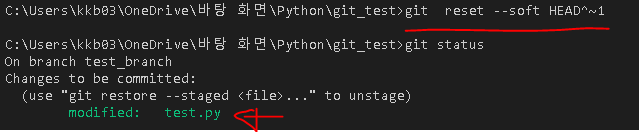 설명 : git add test.py로 파일을 staging area로 추가시키고, git reset HEAD test.py로 파일을 working directory에 다시 되돌린다.